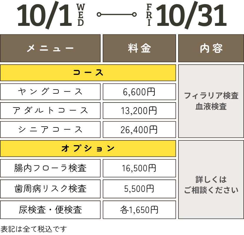 秋は気温の変化が大きく、夏の疲れが出やすい季節です。大切なワンちゃんの健康診断を行うことで、内臓の異常や皮膚トラブル、関節の不調などを早期に発見できます。冬に備えて体調を整えるためにも、秋の健診はワンちゃんの健康管理にとって重要です。Dyplus麻布台でも春秋2回の定期的な健康診断をおすすめしています。