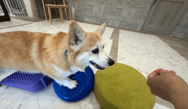 プレイルーム内を愛犬を乗せてお好きなバギーで試乗体験。冷たいお水とオシボリをご用意。